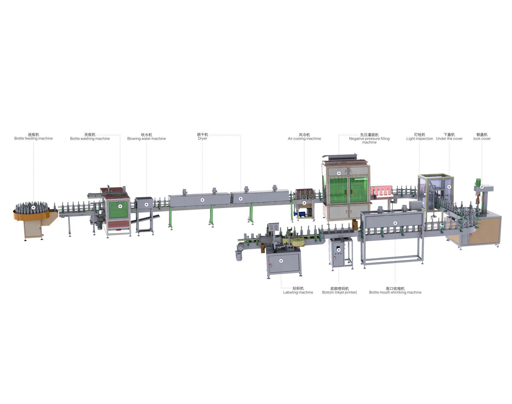 送瓶洗瓶烘干8头灌装锁盖收缩喷码贴标生产线